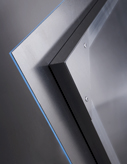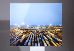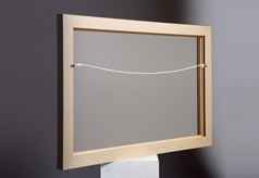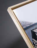 Le tirage est positionné dans un cadre en aluminium protégé par une plaque de verre. Un passe-partout biseauté et découpé sur mesure permet d'éloigner la photographie du verre afin d'éviter toute altération par condensation. C'est la solution la plus classique, un compromis parfait entre élégance et protection.